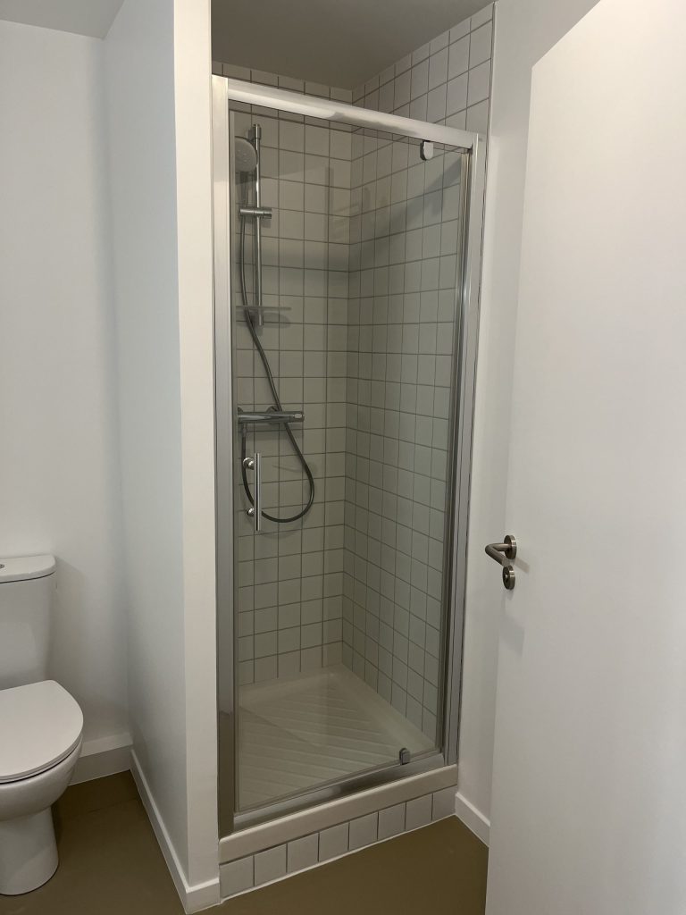 – Meuble de hall sur-mesure en marqueterie bois réemployé in situ, intégrant boîtes aux lettres, corbeille, compteurs et gaines