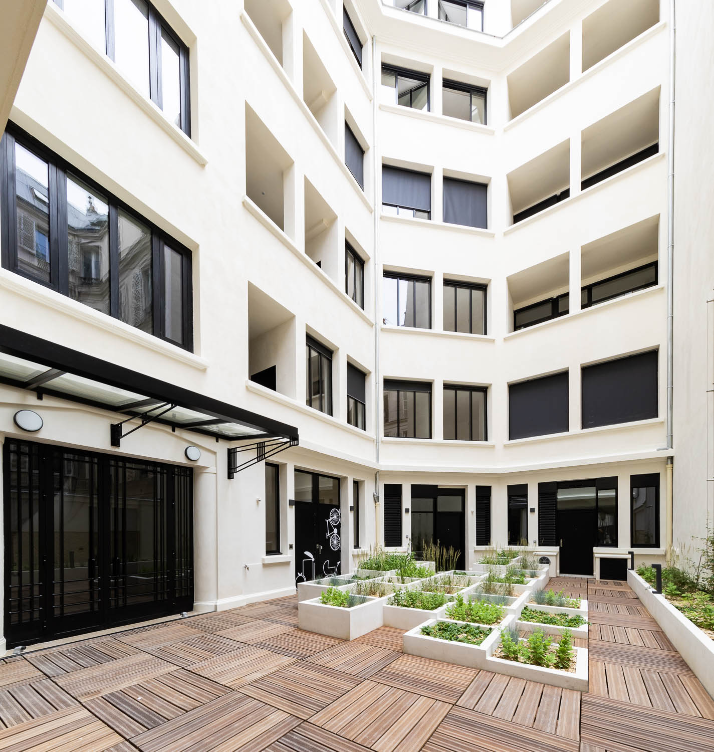 Le projet se caractérise également par son engagement environnemental fort, répondant au Plan Climat Elogie-Siemp, avec le réemploi de matériaux existants (serrurerie, ferronnerie, carreaux de carrelage) et création d'un jardin de pluie, de terrasses végétalisées et d'une toiture terrasse potager. Sur cette réhabilitation lourde en milieu inoccupé, les façades ont été conservées et restaurées à l'existant. Les toitures-terrasses sont également végétalisées.