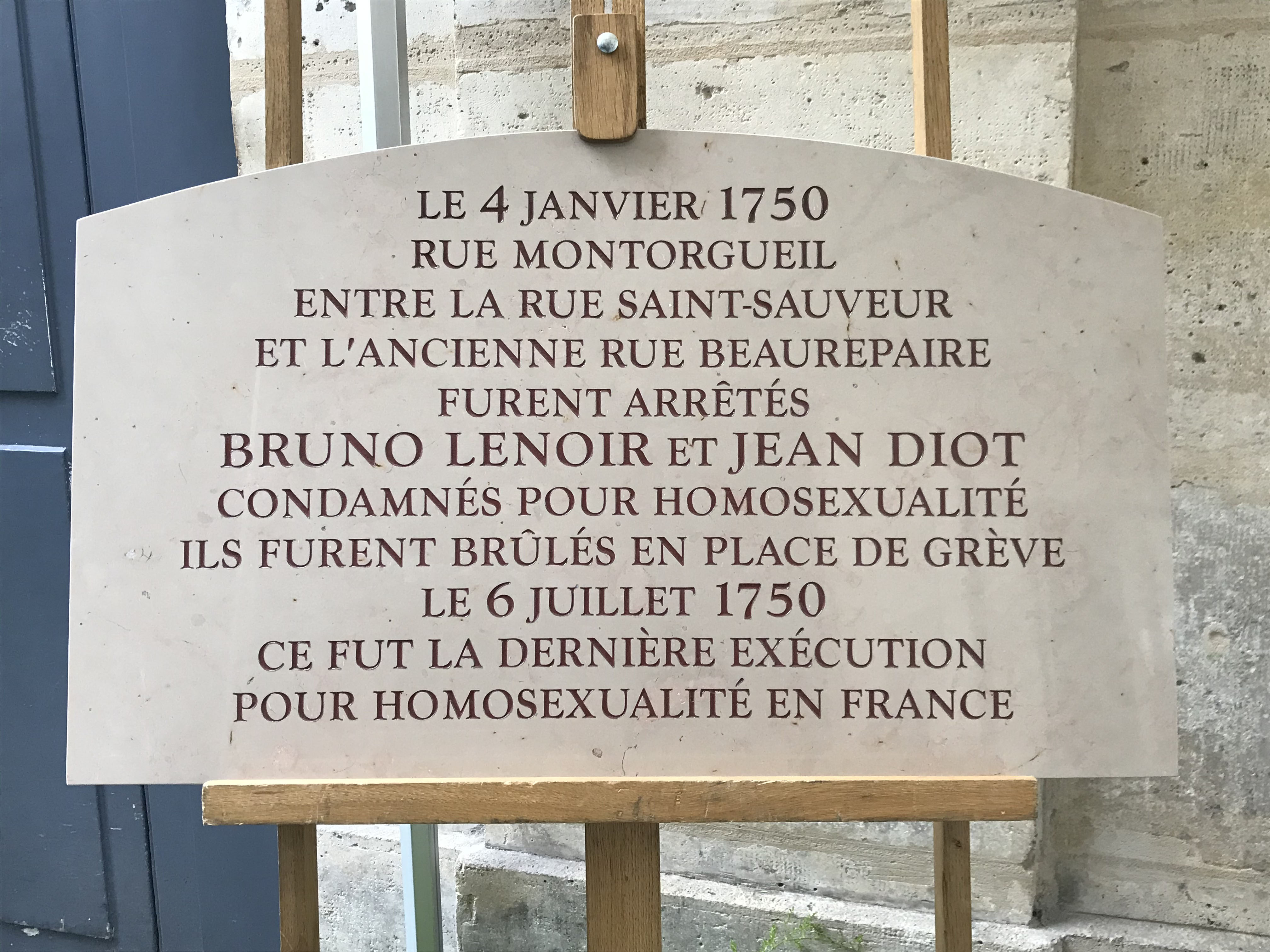 Le 17 mai 2021, journée mondiale contre l'homophobie, la transphobie et la biphobie, la Ville de Paris a rendu hommage à Bruno LENOIR et Jean DIOT, dernier couple homosexuel exécuté à Paris le 6 juillet 1750.