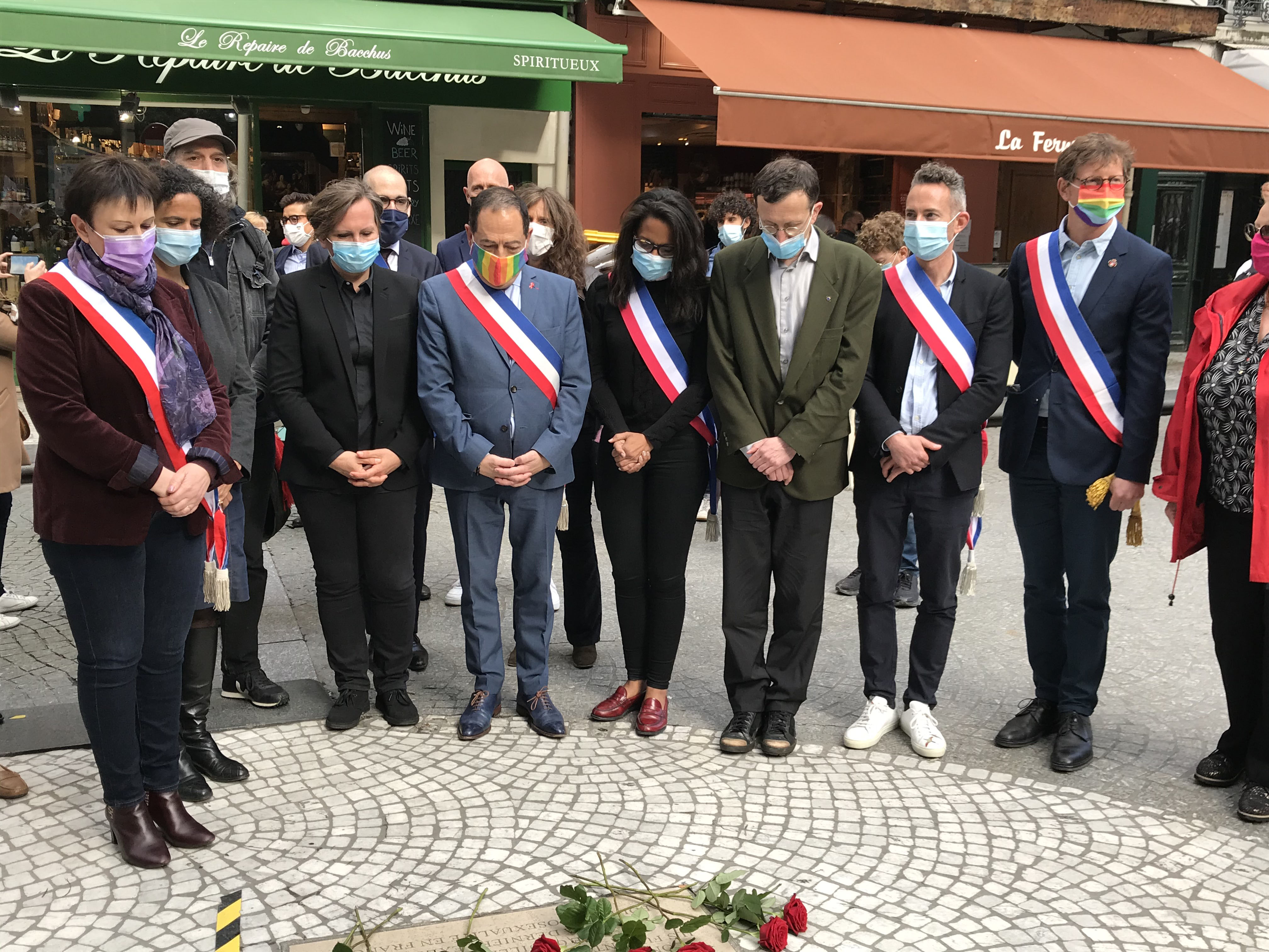 Puis, le cortège s'est rendu à l'angle des rues Montorgueil et Bachaumont, pour un moment de recueillement et un dépôt de roses, sur l'ancienne plaque apposée au sol qui a été vandalisée à plusieurs reprises en 2018.