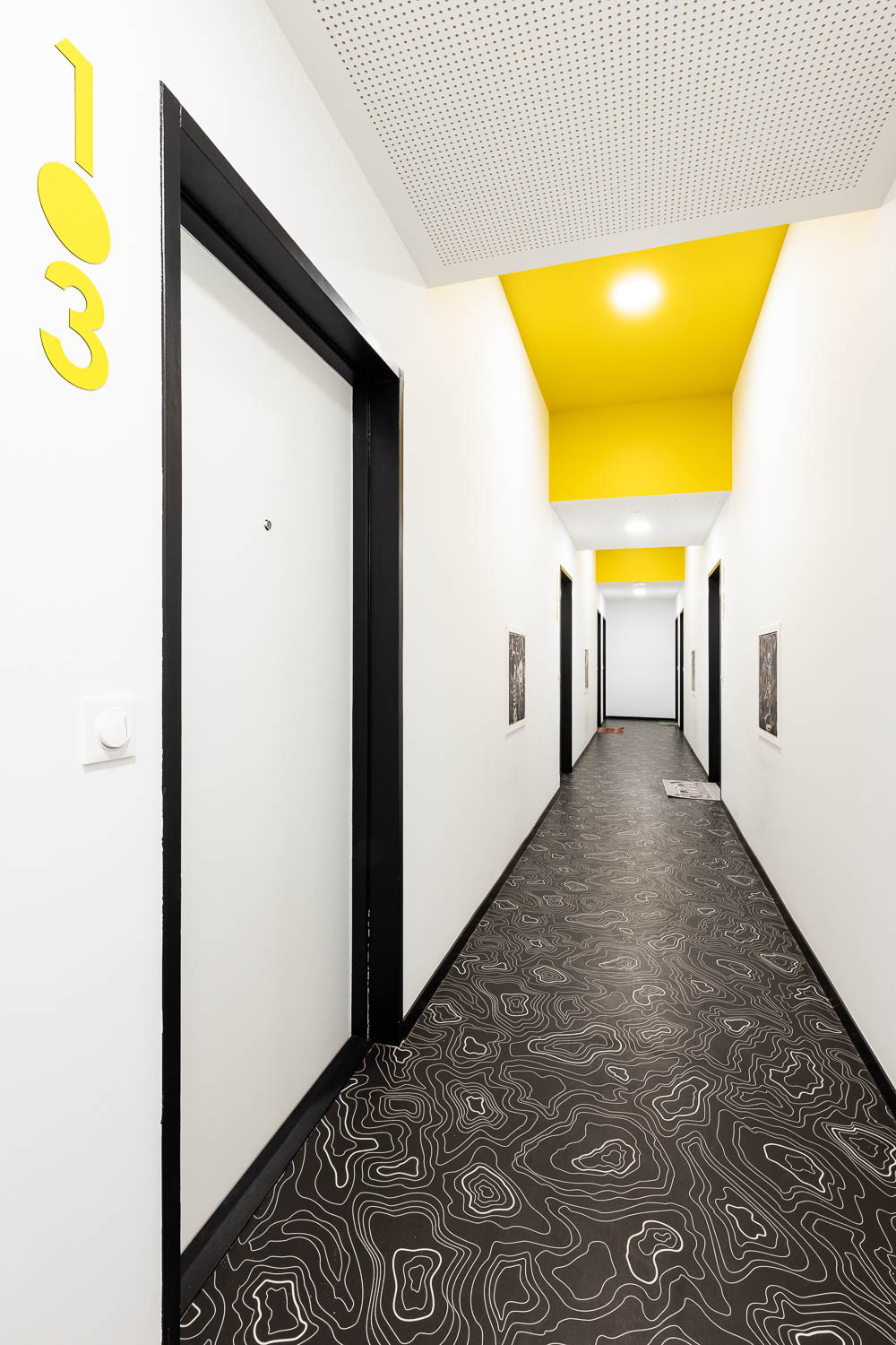 La résidence sociale accueille un local de stockage, des bureaux, une loge et une laverie. Les studios sont aménagés sur les 3 niveaux d'étage. Un « cœur de bâtiment » a été créé et se traduit par la création d'un patio où des espaces de vie commune de la résidence sociale seront aménagés. Il contribue largement à l'apport de lumière naturelle dans les parties communes de tous les niveaux.