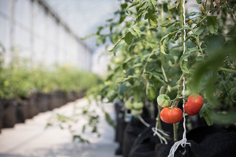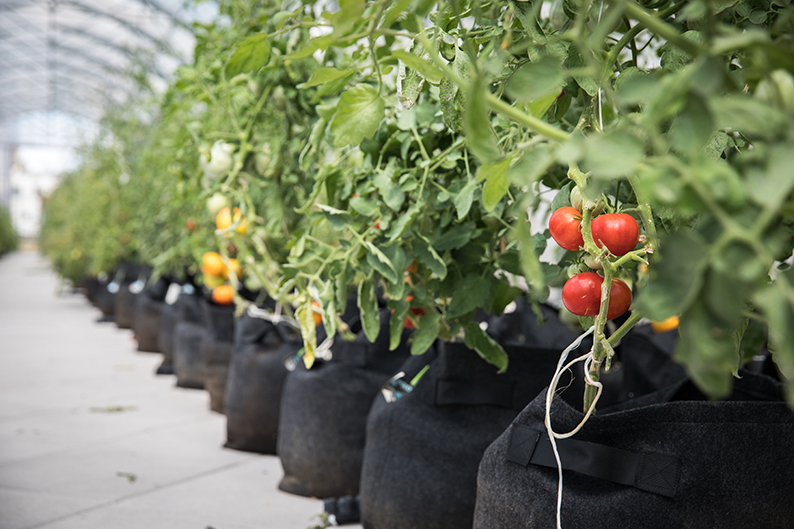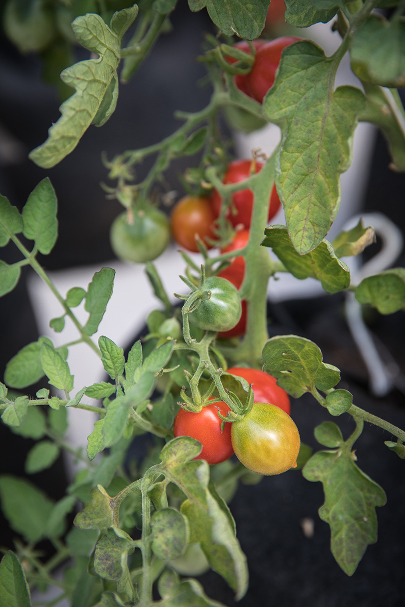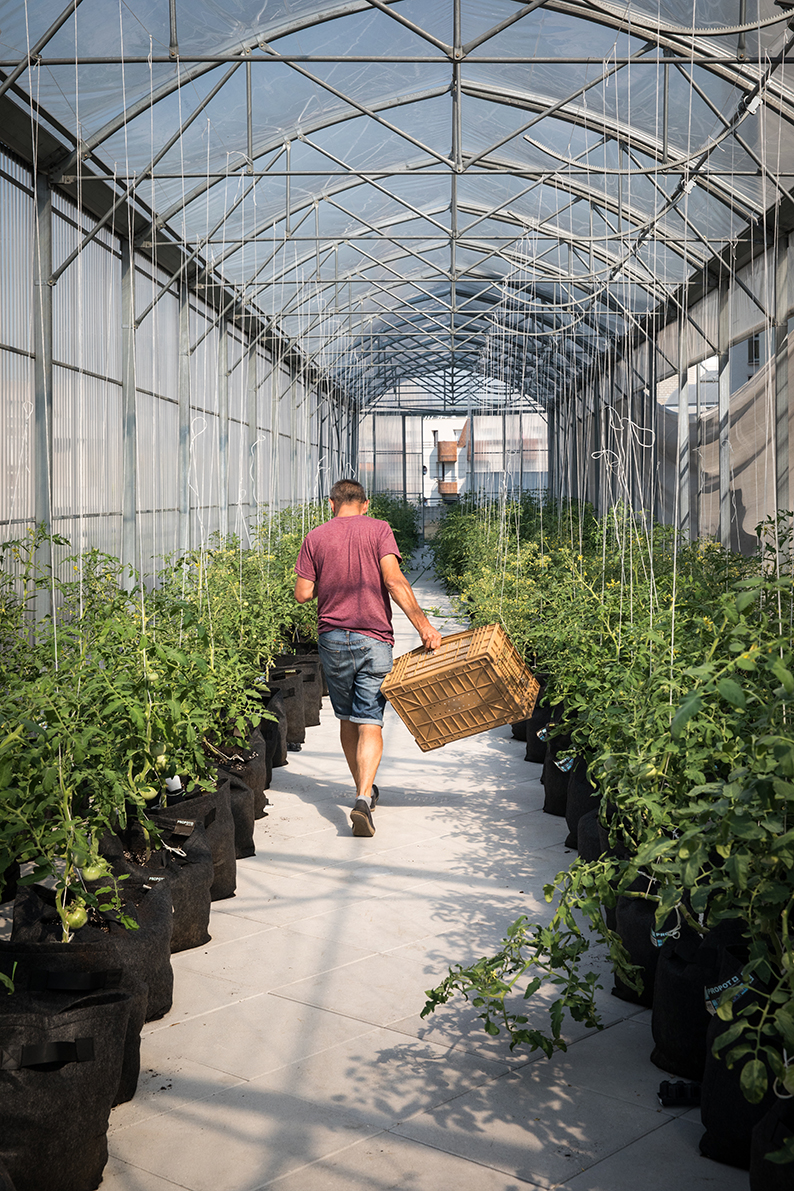 Cette serre abrite 12 variétés de tomates sur 350 m² de culture et des dizaines de variétés micro-pousses sur 100 m² de culture sur table.