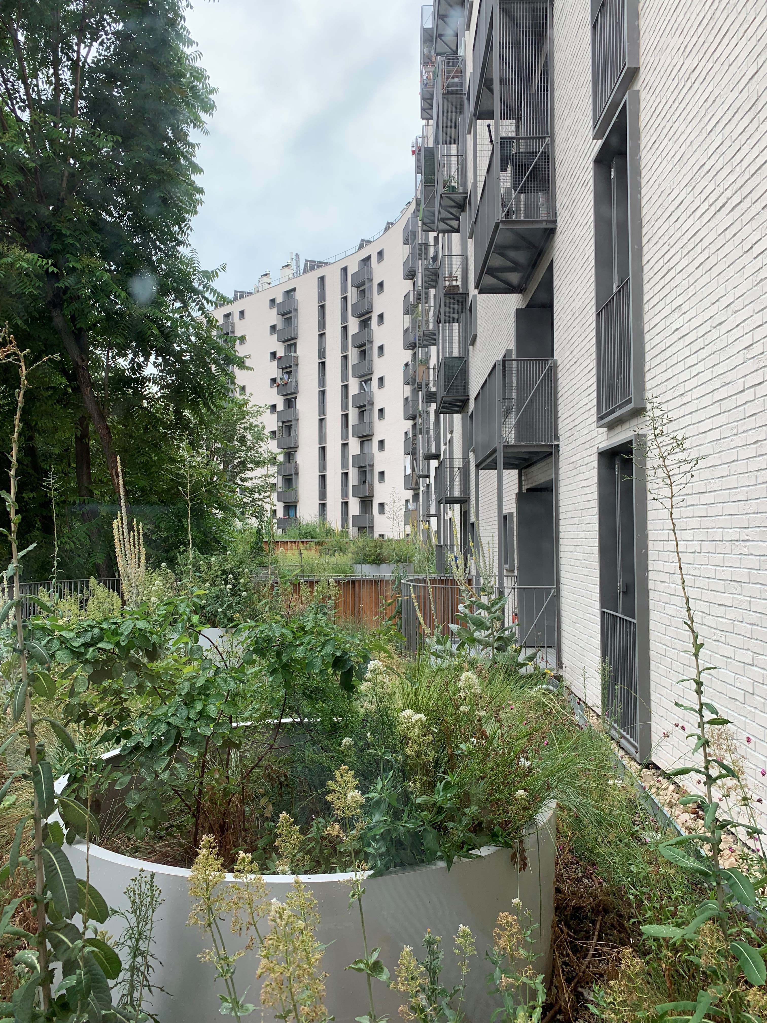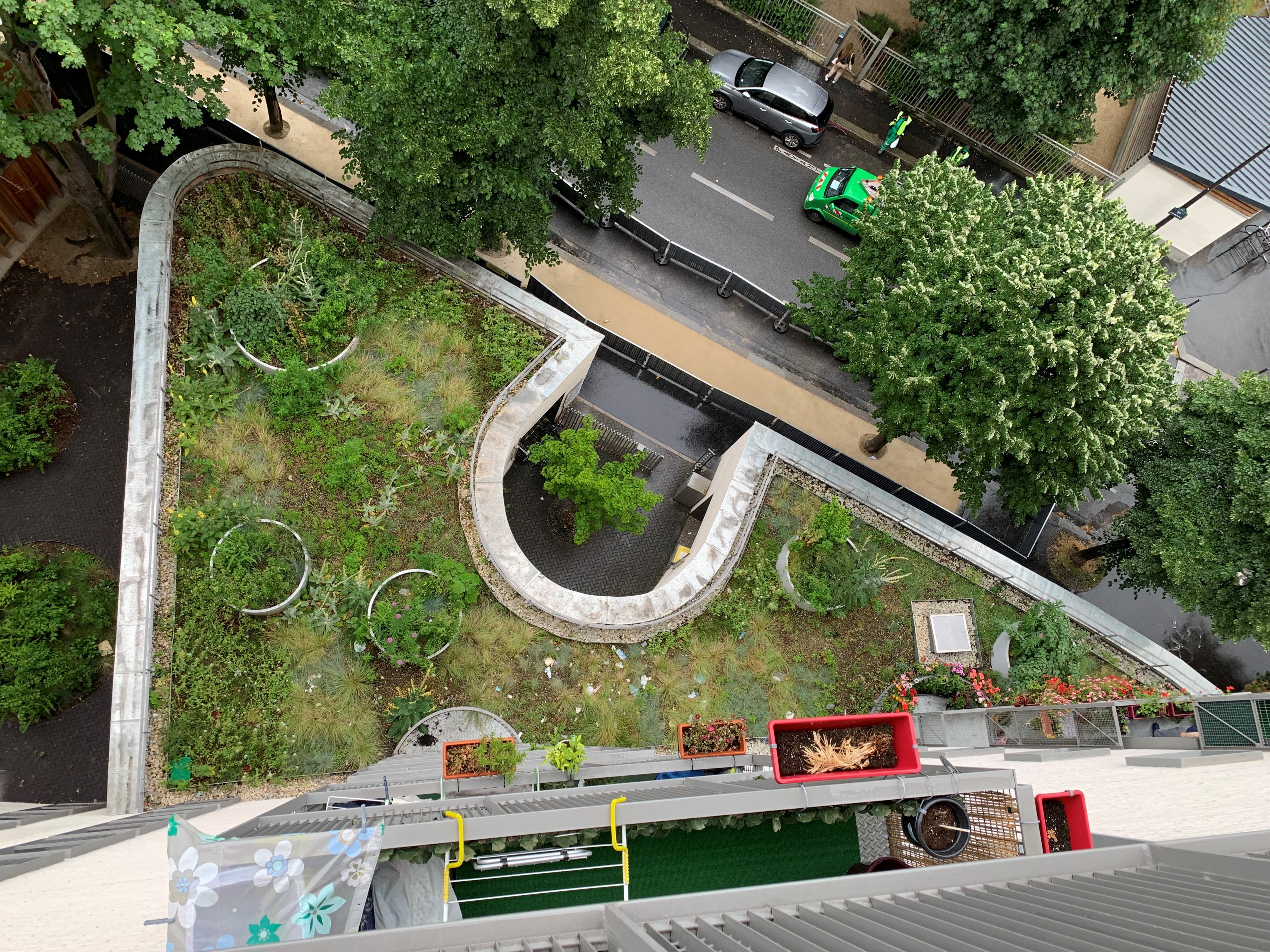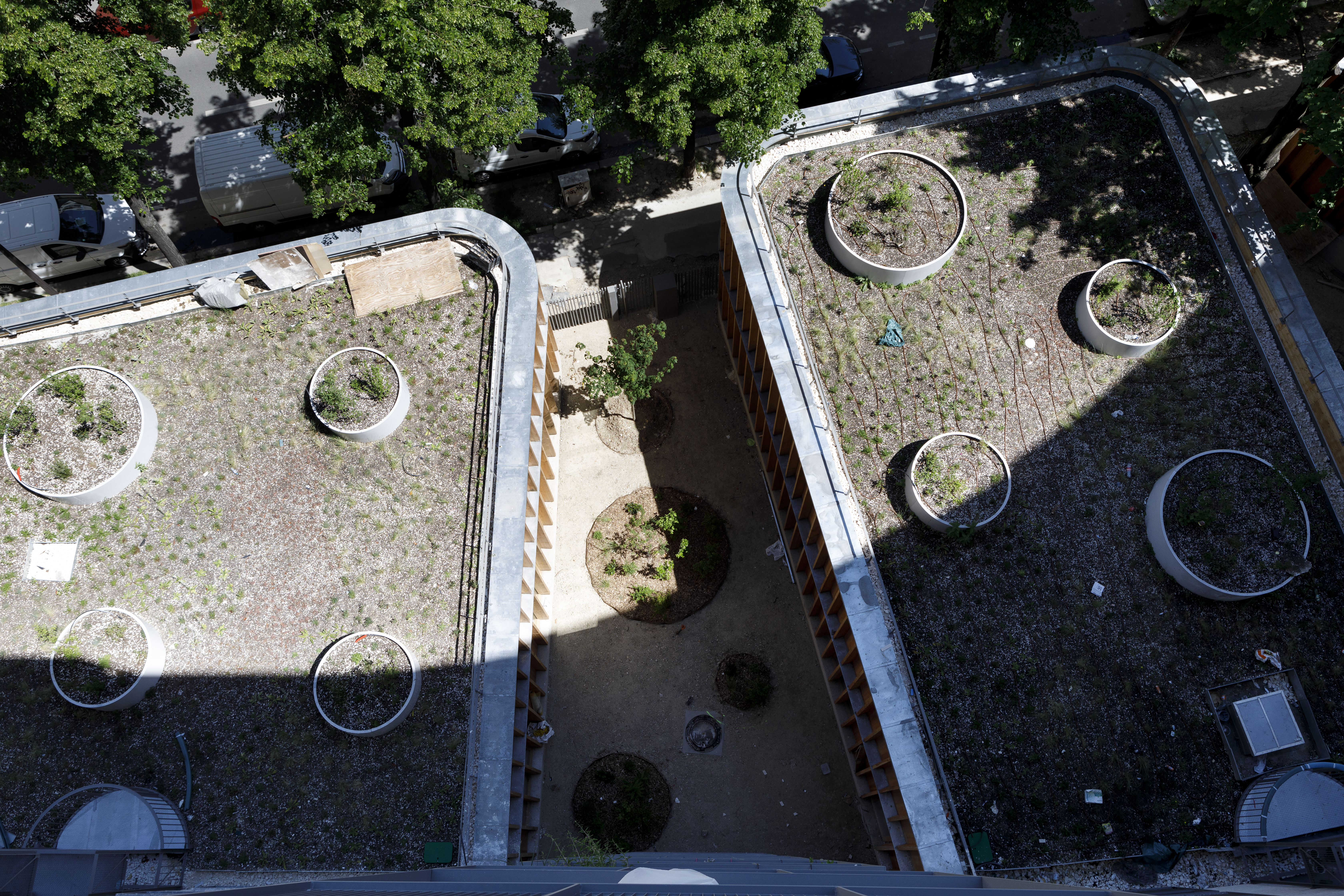 Des aménagements extérieurs temporaires ont été réalisés. À cet effet, un jardin provenant d'une exposition du Pavillon de l'Arsenal et conçu par « Asphalte Jungle » a été récupéré pour être transplanté sur site.